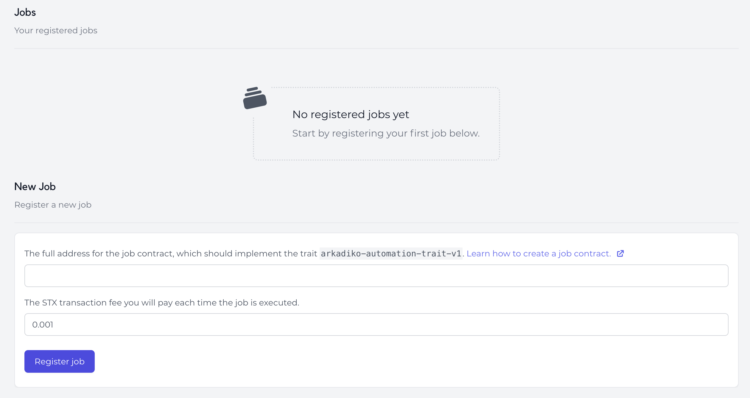 You can easily register your job which will be displayed if it is implemented with the `arkadiko-automation-trait-v1`&#x20;